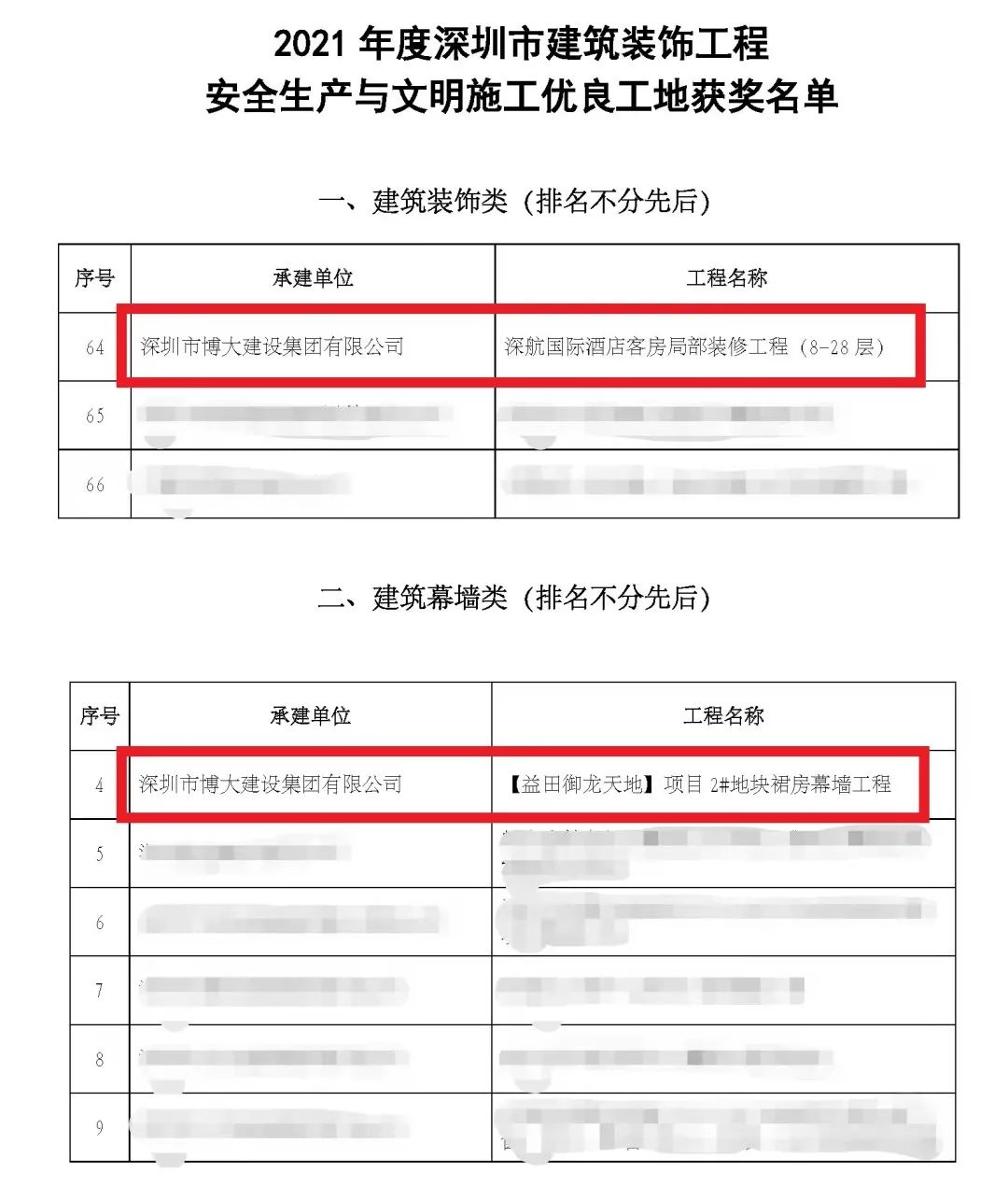 博大建設(shè)集團(tuán)榮獲兩項(xiàng)深圳市建筑裝飾工程安全生產(chǎn)與文明施工優(yōu)良工地