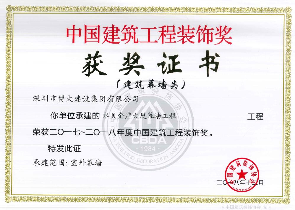 博大建設(shè)集團(tuán)承建的昆明醫(yī)科大學(xué)第一附屬醫(yī)院3號(hào)樓、華遠(yuǎn)金外灘四期君悅酒店、綠景虹灣裙樓商業(yè)公共部分、水貝金座大廈幕墻工程、天健科技大廈幕墻工程等5個(gè)經(jīng)典工程以卓越品質(zhì)榮獲中國(guó)建筑工程裝飾獎(jiǎng)。