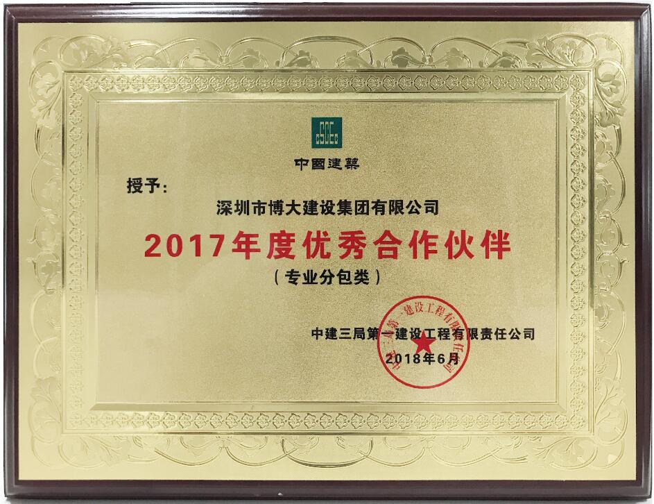 博大建設(shè)集團(tuán)以優(yōu)秀的工程質(zhì)量和準(zhǔn)時交期,協(xié)助中國鐵建奠定了西派國樾精裝大平層的品牌效應(yīng),榮獲中國鐵建優(yōu)秀合作方。
