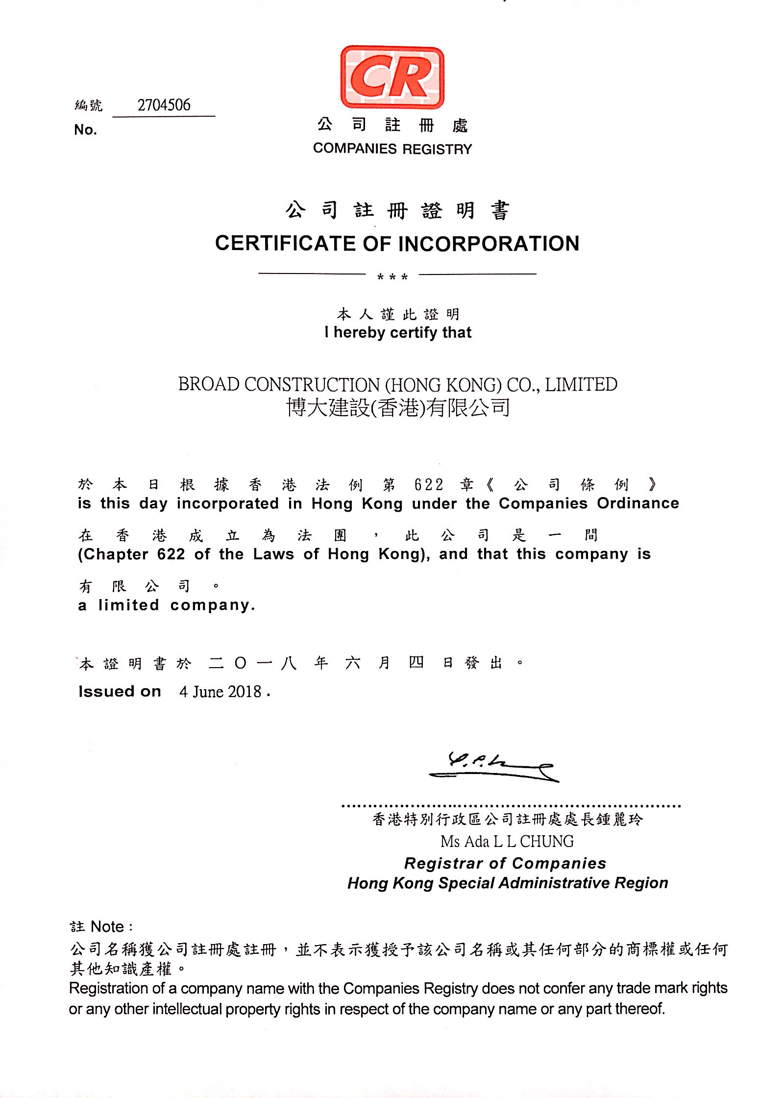 6月4日,博大建設集團香港公司正式注冊成立,博大建設集團總部設在深圳,加上之前成立的澳門公司,初步完成粵港澳大灣區的戰略布局。
