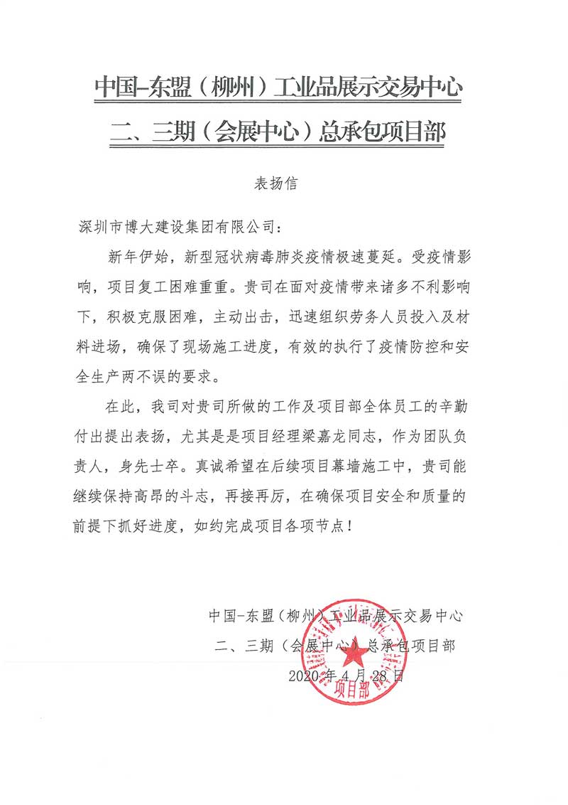 博大建設(shè)集團(tuán)在中國-東盟(柳州)工業(yè)品展示交易中心二、三期(會展中心)項目中,積極克服疫情造成的困難,主動出擊,確保了現(xiàn)場施工進(jìn)度,有效的執(zhí)行了疫情防控和安全生產(chǎn)兩不誤的要求,獲得客戶表揚。