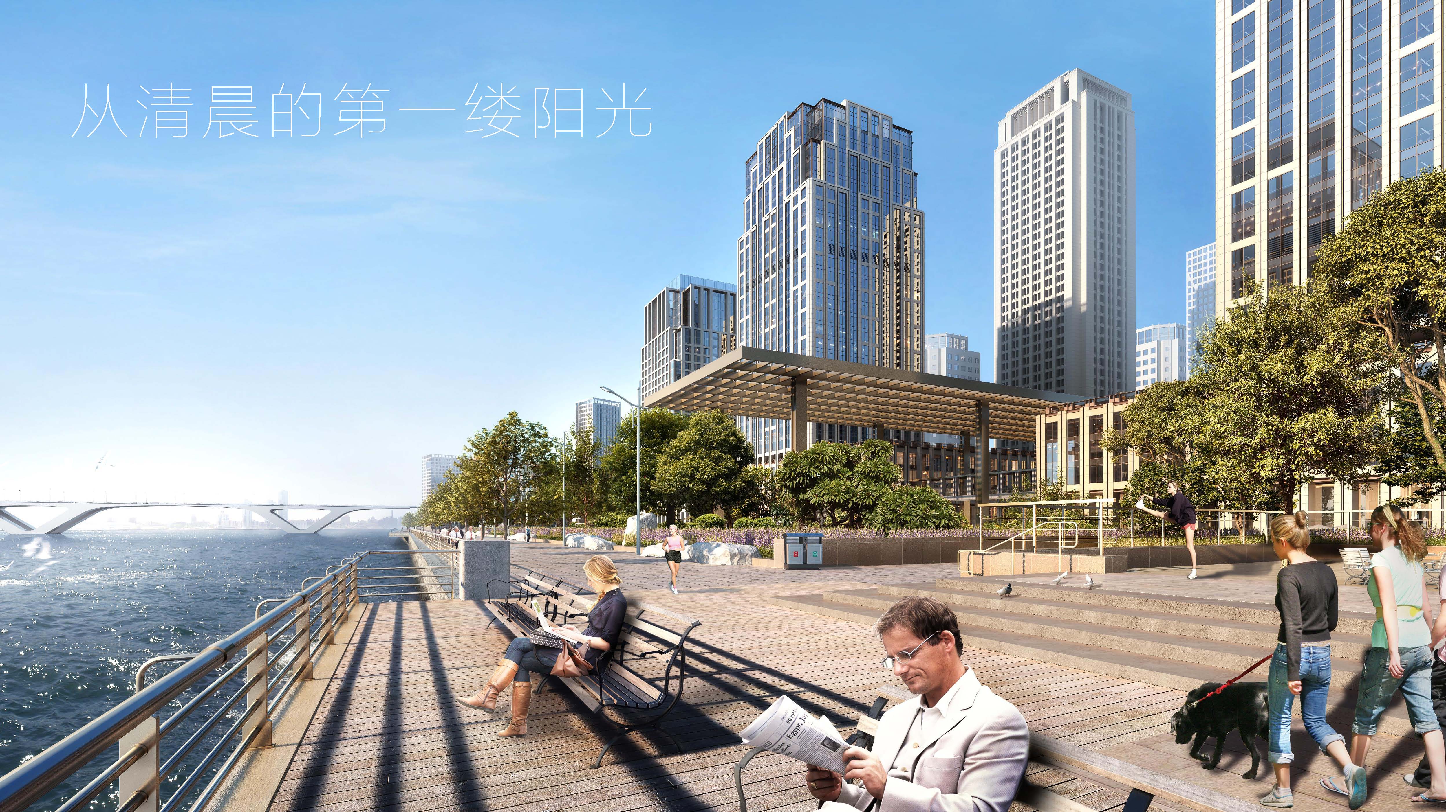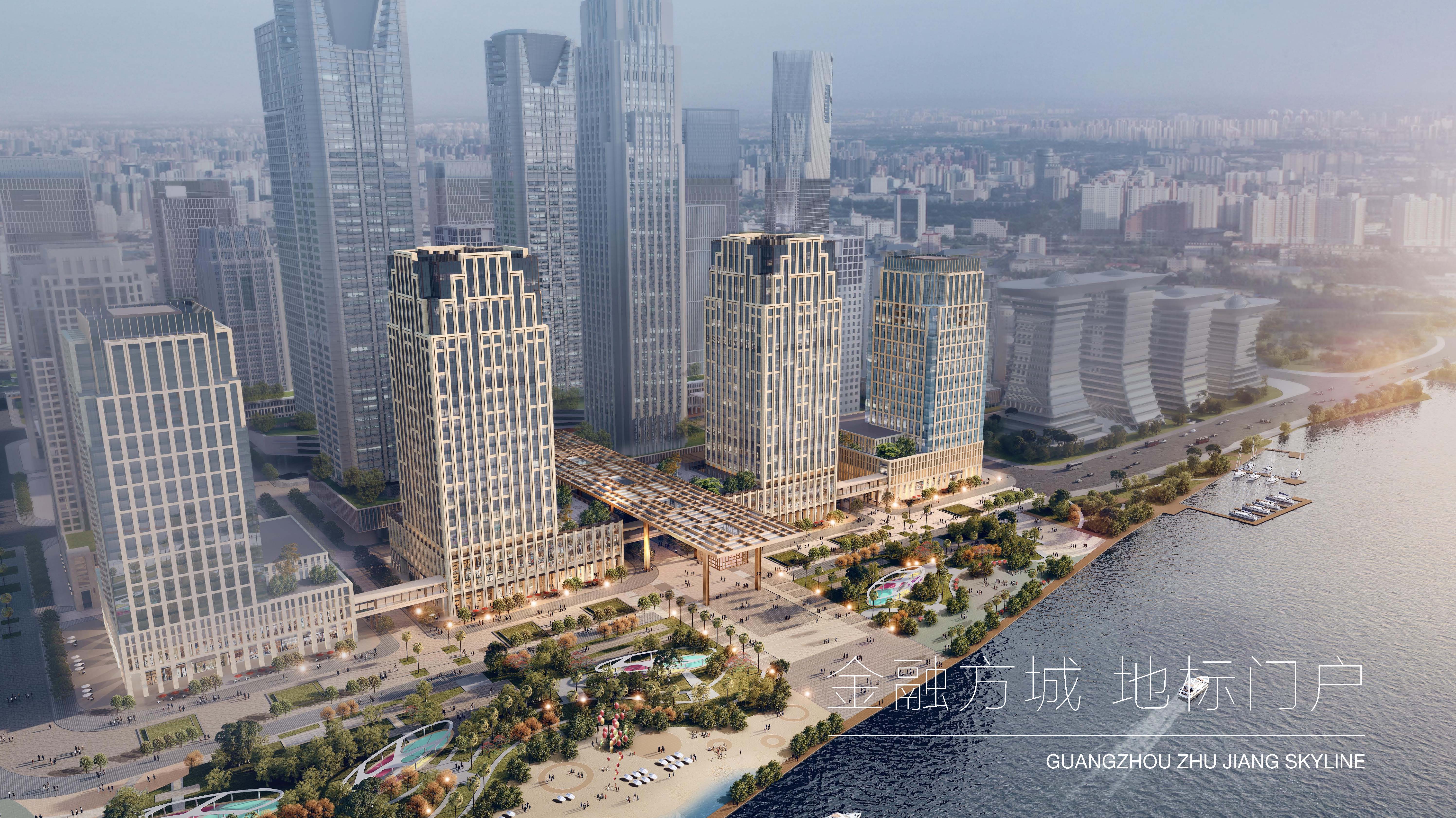 項目位于珠江北岸,緊鄰珠江新城中央商務區,與琶洲國際會展中心隔江相望,是廣州三大CBD之一的國際金融城。以嶺南傳統騎樓的手法延續城市文脈,打造了一個類似都市大平臺功能的相互連接的裙房,并在大平臺上設置了一系列的空中花園、城市觀賞連廊,從而塑造了廣州濱江的門戶形象。