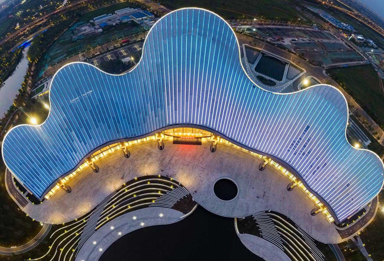 花開紫瑯,藝見南通。南通大劇院矗立在紫瑯湖畔,形似一架協奏的鋼琴,博大建設集團負責劇院屋面幕墻系統、沿湖面幕墻系統、沿街面幕墻系統的施工任務,幕墻及屋面總面積達到8.5萬㎡,在博大鐵軍的精心雕琢下,完美呈現了“琴山珠水”的設計理念。