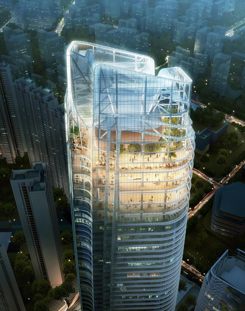 該項目是華僑城集團投資建設的第一個超高層全異形單元式幕墻,施工難度系數極高,為國內首例。博大負責施工的1#樓由一棟近300米的超高層塔樓和附屬裙樓組成,合同總金額超過1.1億。